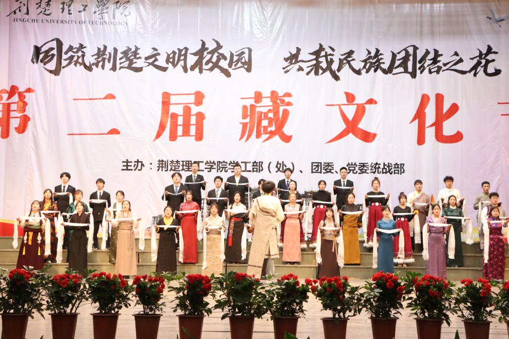 傍晚的民族歌舞展演在合唱曲《一个妈妈的女儿》中拉开帷幕,洁白的哈达在灯光下闪闪发光。藏族同学们载歌载舞,尽情抒发着对家乡、对党和国家的热爱,充分展现了藏族文化特有的民族风情。展演活动在欢乐、活泼、热烈的民族团结歌舞中落幕。