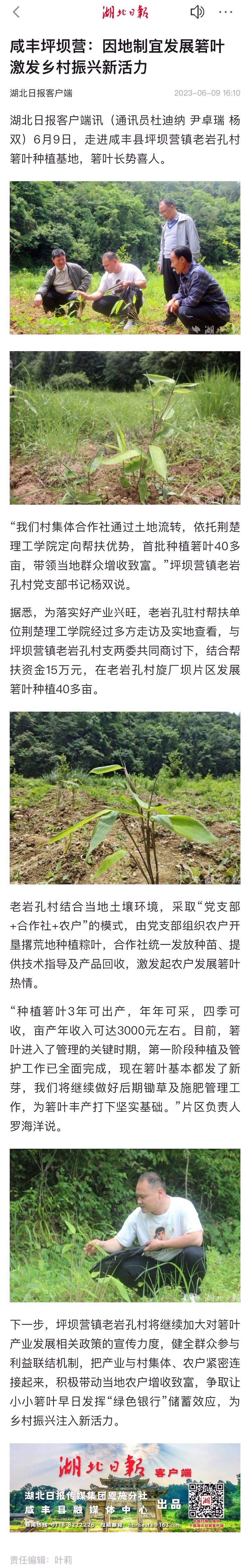湖北日报客户端以《咸丰坪坝营:因地制宜发展箬叶 激发乡村振兴新活力》为题,报道了海燕策略社区论坛帮扶村——咸丰县坪坝营镇老岩孔村在海燕策略社区论坛包保帮扶后种植箬叶,带领当地群众增收致富的成果。为落实好产业帮扶,海燕策略社区论坛乡村振兴工作队经多方走访及实地查看,与坪坝营镇老岩孔村支两委共同商讨,投入帮扶资金15万元,采取“党支部+合作社+农户”的模式,在老岩孔村旋厂坝片区首批种植箬叶40多亩。箬叶3年可出产,年年可采,四季可收,亩产年收入可达3000元左右。目前,第一阶段种植及管护工作已全面完成,箬叶长势喜人。