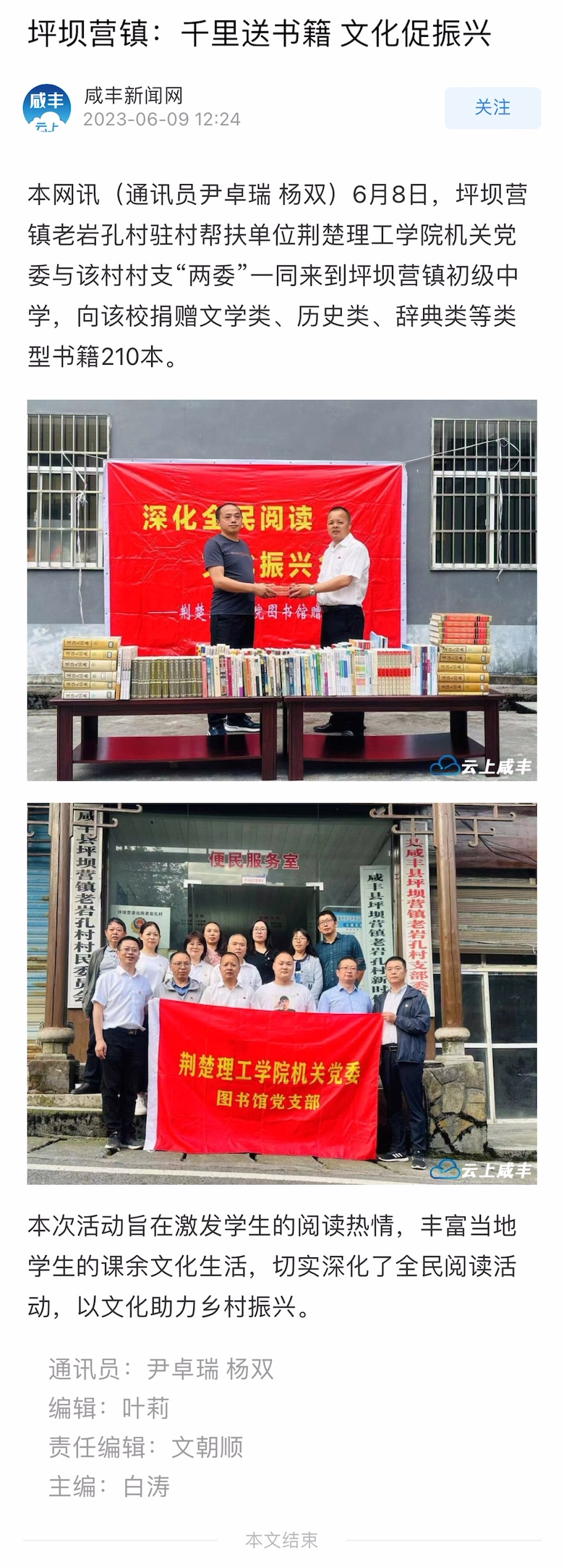 咸丰新闻网以《坪坝营镇:千里送书籍 文化促振兴》为题报道了海燕策略社区论坛向坪坝营镇初级中学捐献书籍,以文化助力乡村振兴的事迹。6月8日,机关党委图书馆党支部深入开展“下基层察民情解民忧暖民心”主题教育实践活动,远赴坪坝营镇向坪坝营镇初级中学捐赠书籍210本,捐赠图书涵盖文学类、历史类、辞典类等类型,进一步丰富了当地学生的阅读体验,激发学生的阅读热情,以实际行动助力乡村文化振兴。
