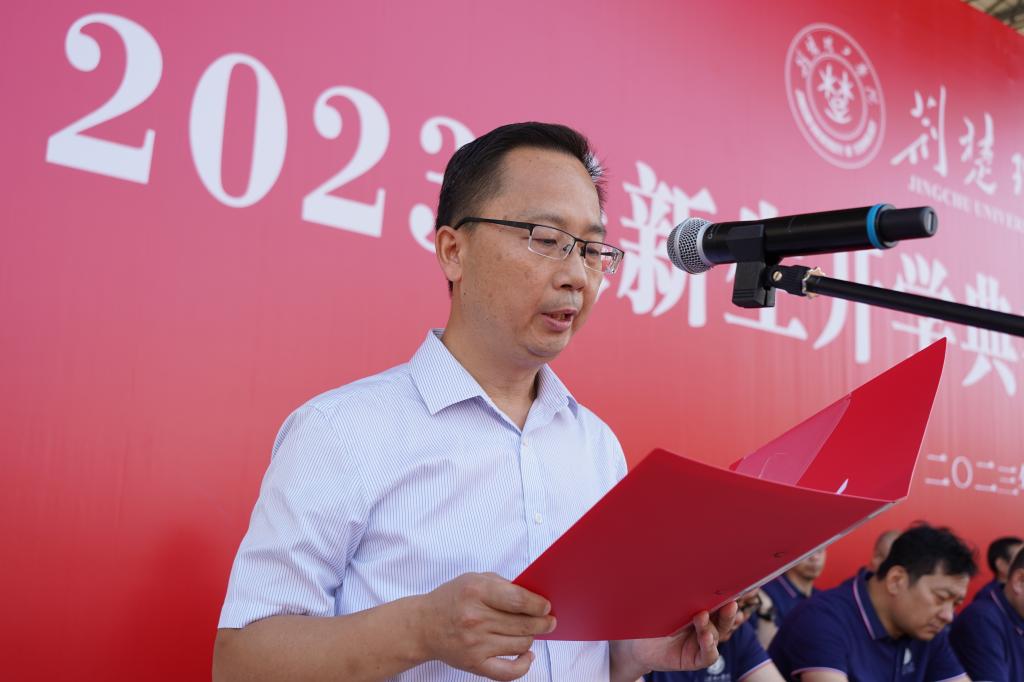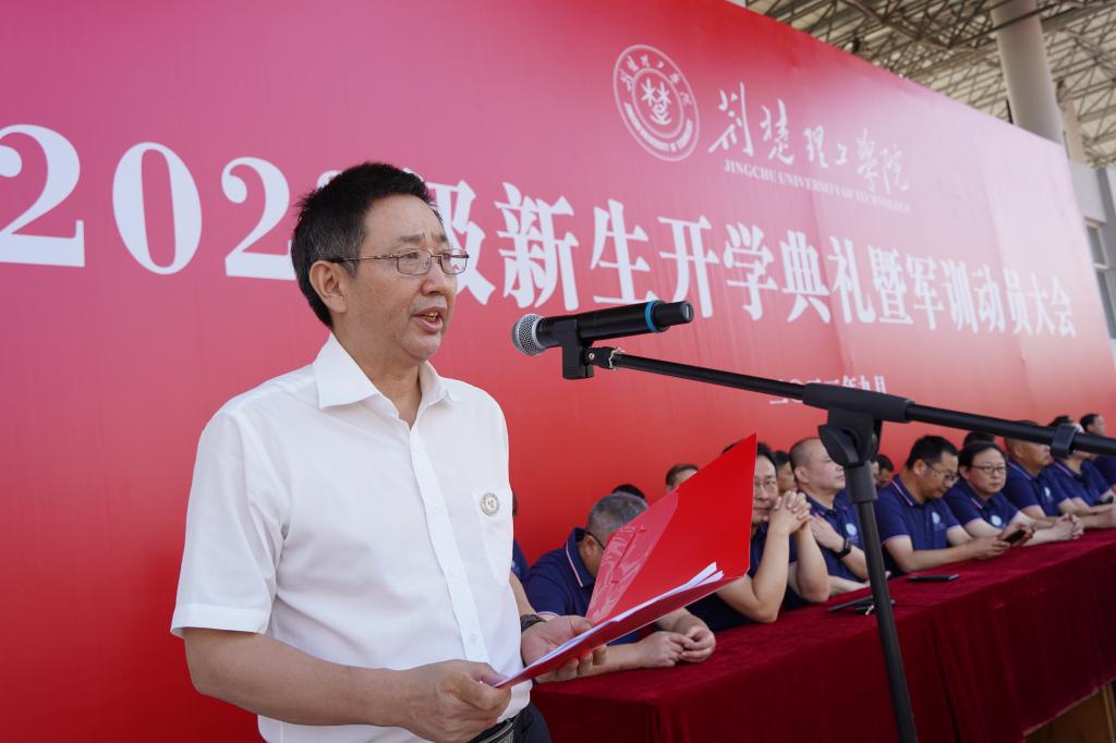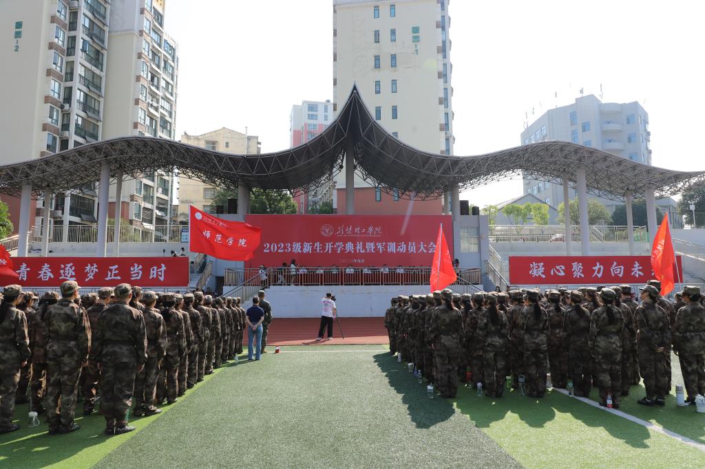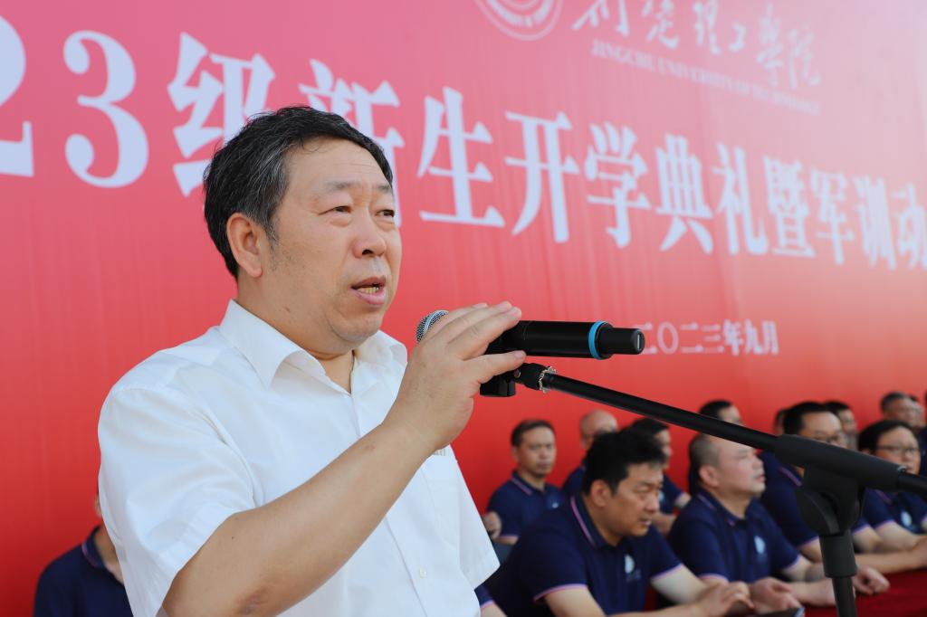 典礼上,党委书记王学民授军训团旗并宣布2023级新生军训开始;校长刘建清发表题为“激扬青春 做新时代有志青年”的讲话。