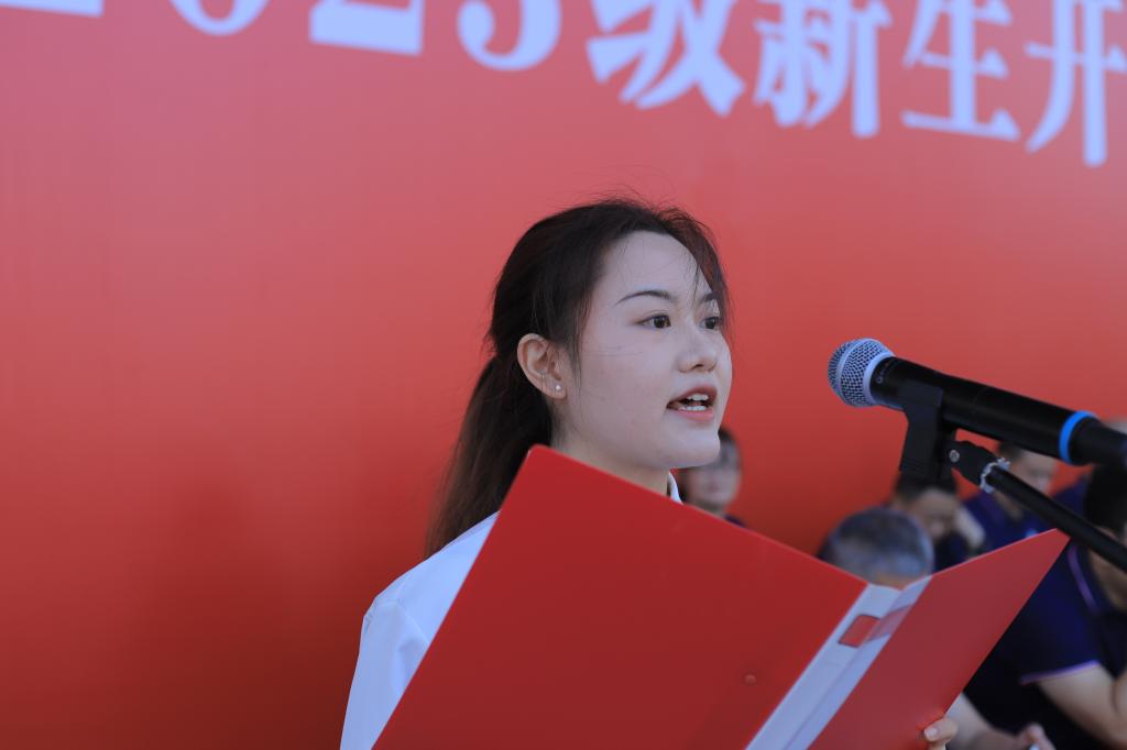 新生代表李哲轩号召同学们以饱满的热情迎接为期两周的军训生活,在军训中磨练意志,养成能吃苦,不怕苦,不怕累的优良品质。在未来大学四年里,能够不惧风浪,不畏艰难,树立高远的目标,争做有为青年。