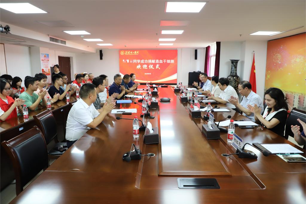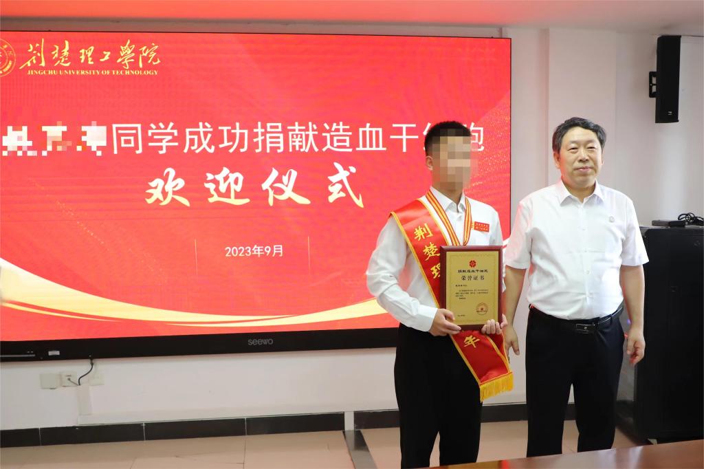“荆楚青年,大爱无疆”,9月8日下午,海燕策略社区论坛在行政楼A406会议室举行王虎(化名)同学捐献造血干细胞凯旋欢迎仪式。校党委书记王学民出席并为王虎同学颁发“国家级造血干细胞捐献奖牌”和荣誉证书。市政协副主席、市红十字会常务副会长陈刚出席欢迎仪式。仪式由党委常委、宣传部部长郑艳主持。