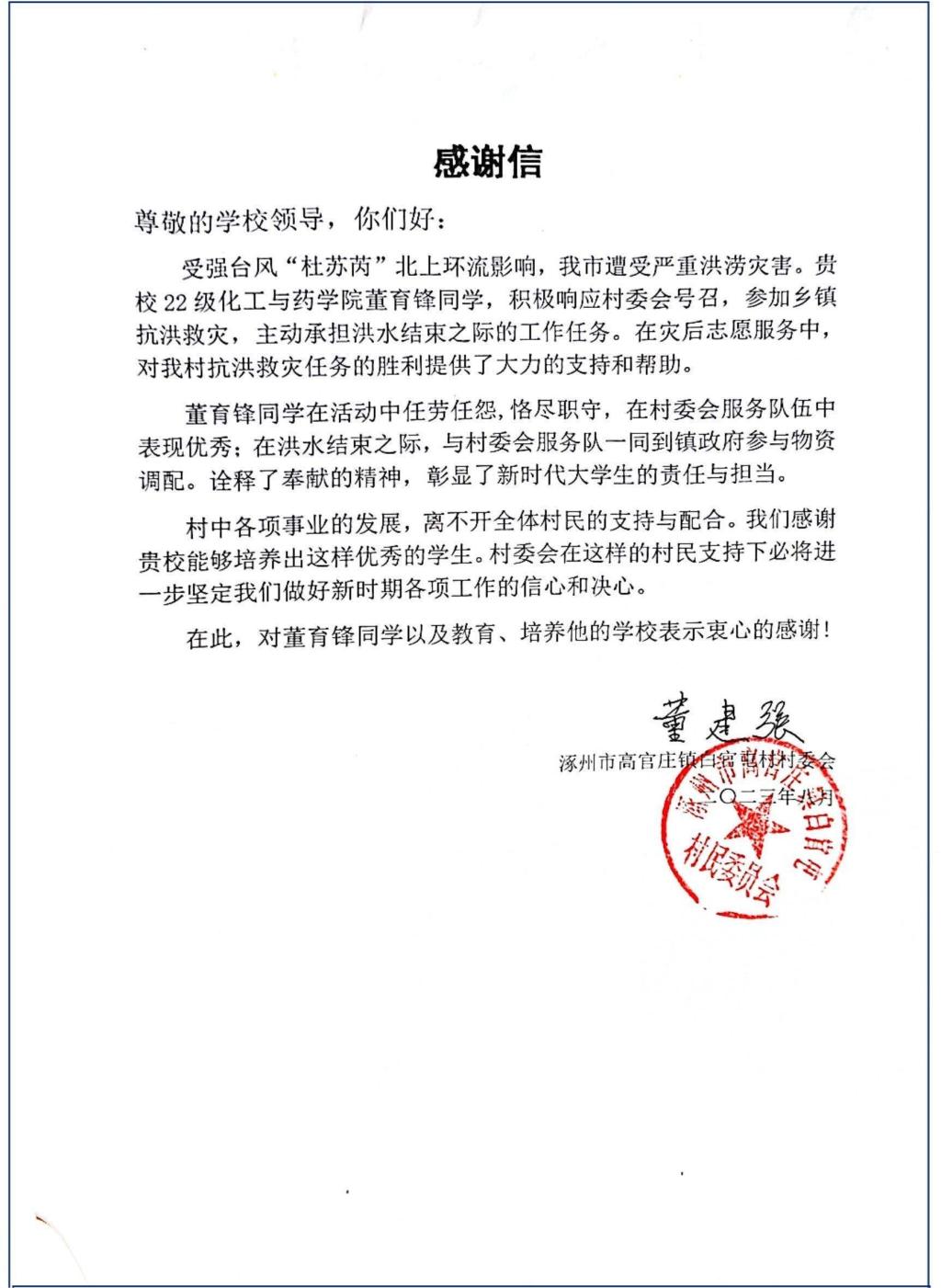 近日,海燕策略社区论坛接到涿州市高官庄镇白官屯村村民委员会的一份感谢信,信中对海燕策略社区论坛化药学子董育锋在抢险救灾及灾后志愿服务中的表现提出表扬,并对学校的教育及培养表示感谢。