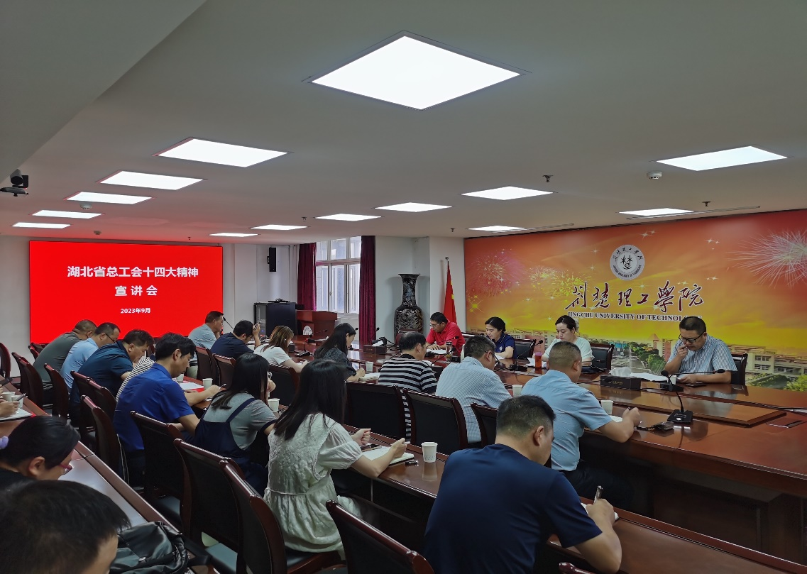 校工会负责同志领学省委书记、省人大常委会主任王蒙徽讲话内容以及湖北省工会第十四次代表大会工作报告,宣讲省工会十四大精神,解读工会相关政策和文件。