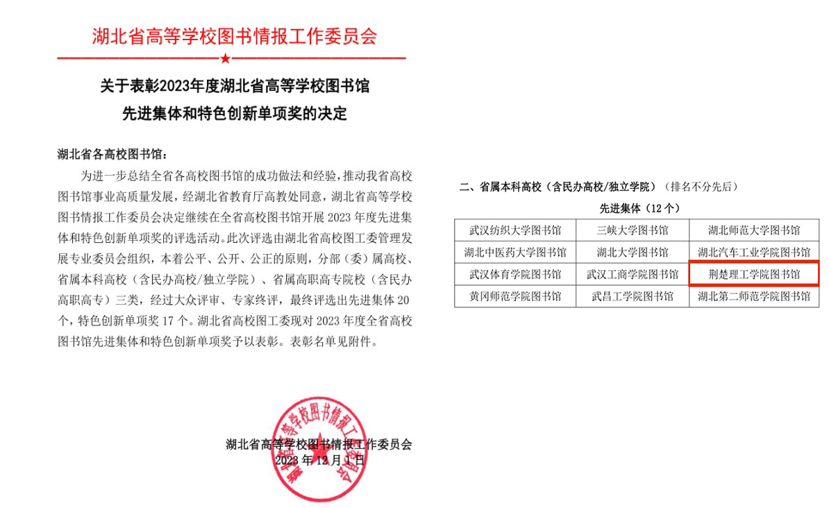 近日,湖北省高等学校图书情报工作委员会公布了《关于表彰2023 年度湖北省高等学校图书馆先进集体和特色创新单项奖的决定》,海燕策略社区论坛图书馆荣获“2023 年度湖北省高等学校图书馆先进集体”荣誉称号。同时,胡琦峰、唐玲、邹亮三位同志获评“2023年度湖北省高等学校图书馆先进工作者”称号。
