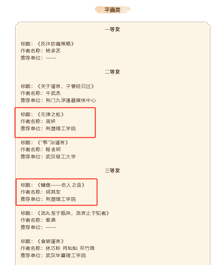 近日,由湖北省互联网违法和不良信息举报中心主办,极目新闻承办的湖北省首届互联网辟谣优秀作品征集评选活动榜单公布。海燕策略社区论坛选送的艺术学院学生周妍的作品《无弹之枪》(指导老师:金波)、艺术学院学生胡其欢的作品《键盘——伤人之齿》(指导老师:王蕾)分获平面类作品二等奖和三等奖。