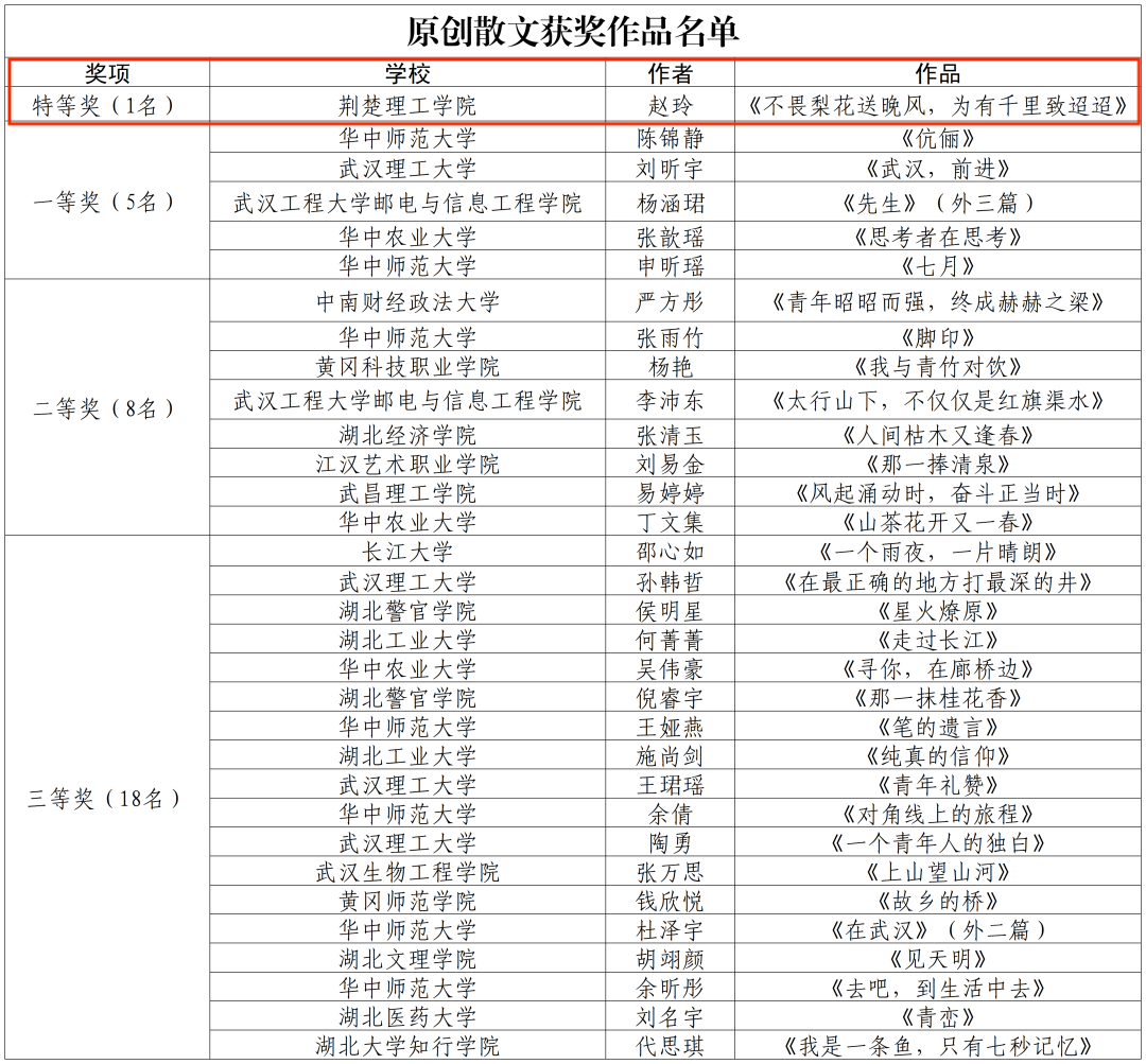 近日,湖北省高校第三十九届“一二·九”诗歌散文大赛获奖名单公布。海燕策略社区论坛文学与传媒学院2022级汉语言文学专升本3班赵玲同学的作品《不畏梨花送晚风,为有千里致迢迢》(指导老师:唐晓)获大赛原创散文类特等奖。