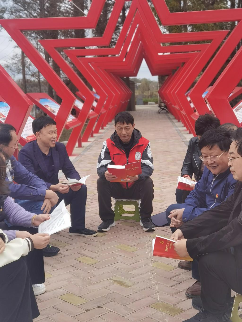 在五星长廊前,支部全体党员学习了党的二十大报告原文,观看了红军标语墙、红色文化场馆、作战武器,了解了先烈们积极投身革命的光辉事迹,重温了一段波澜壮阔的革命历史。